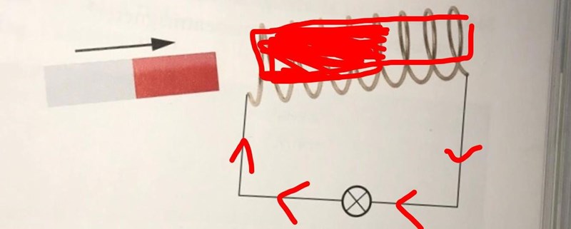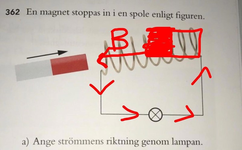 Jag tänker att magnetfältet kommer gå ut från magneten som UPPGIFTEN HAR RITAT, vi behöver därför ha en magnet med motsatt magnetfält... då bör en magnet ritas så så att magnetfältet pekar ut i motsatt håll enligt lenz lag. Om tummen är nordände och pekar som magneten jag har ritat kommer strömmen gå som jag har ritat ut. Stämmer min tanke? Hoppas verkligen att det är rätt att tänka annars ger jag upp på att förstå hela detta kapitel :-(