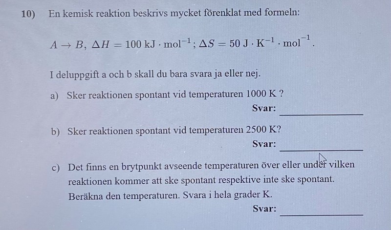 Hej, har stött på den här uppgiften och jar svårt att komma framåt. Jag vet om villlorken till spontana reaktioner som beror på om reaktionen är exoterm eller endorerm, och om oordningen är ökad eller minskad. Men hur ska jag sätta in 1000 K eller 2500 K? Finns det någon formel för att räkna ut detta?
