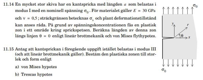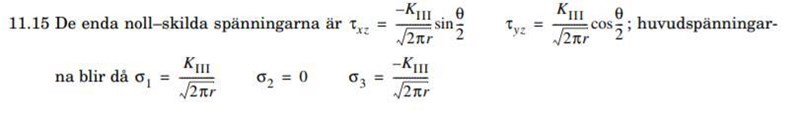 Har problem med uppgift 11.15 nedan. I min kursbok hittar jag endast formler för spänningarna när det är modus I belastning, är det meningen att man ska härleda uttrycken i facit med hjälp av dessa på något sätt? Och i så fall hur?