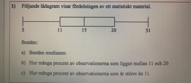 852sol skrev:AlvinB skrev:Lådagrammet visar ju kvartiler ordnade i storleksordning. Vi ser alltså att mellan 3 och 11 ligger de minsta 25 procenten, och således måste de kvarvarande 75% vara större än 11.