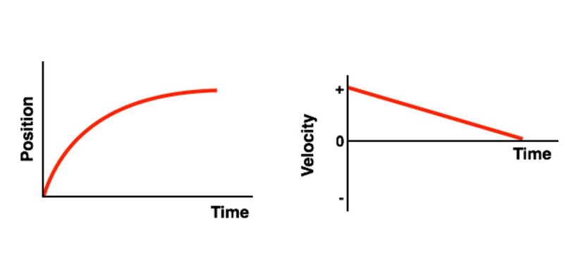 I det första fallet är accererationen negativ, i det andra positiv. I det första fallet minskar lutningen för positions-kurvan, i det andra ökar den.