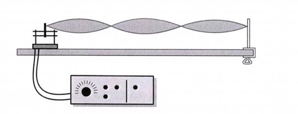 I bilden ovan ser du en vibrator som svänger med 510 Hz. Den svängande strängens längd är 67 cm.
