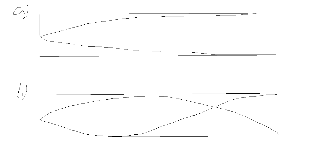 Hej! Har en fråga om stående vågor i ett halvtäppta rör. I exemplet nedan måste ju vänstra sidan vara en nod då det är stängt och högra delen bukt då det är öppet. Då a är grund tonen, borde b kallas första (λ2) eller andra övertonen (λ3)? Tänker att den kan tänkas kallas första övertonen då det är nästa möjliga konfiguration för en stående våg, men samtidigt skulle då former som Fn = f1 * n eller λn = λ1/n inte fungera då λ1 har tvingats att delas med tre i b för att passa vilkoren, istället för två som den gör i vanliga fall.
