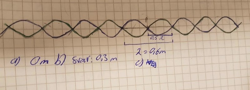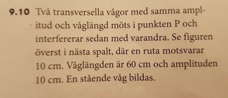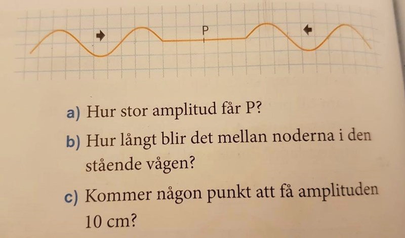 c) Frågan tycks vara fel ställd. Redan i figuren kan man se en amplitud på 10cm. Menar man t.ex.: När punkten P har maximal amplitud, kommer någon punkt på den stående vågen ha en amplituden på 10cm...Ja.