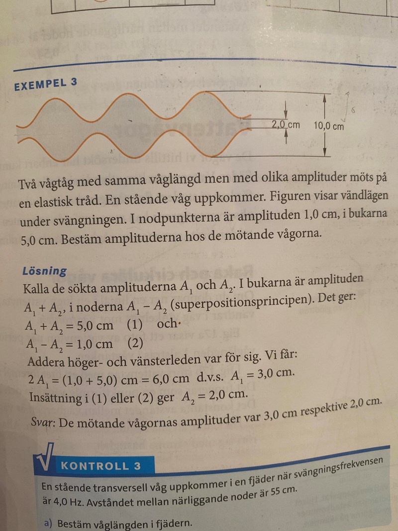 Hej jag skulle behöva hjälp med att förstå lösningen på ovanstående uppgift. Jag förstår inte varför man adderar amplituderna i bukarna och subtraherar i noderna, eller vad den ovanstående bilden ska visa? Ska figuren visa den stående vågen? Varför ska man subtrahera amplituden vid noderna när noderna i de enskilda vågorna inte ens bör ha en amplitud?