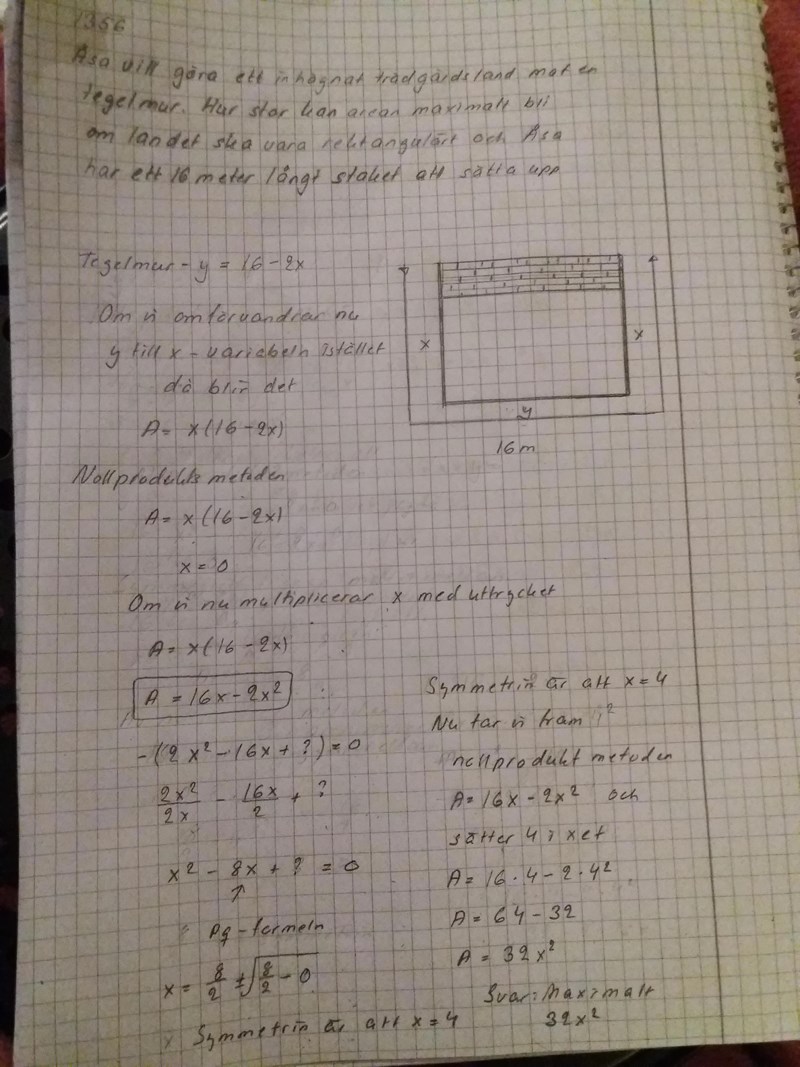 Åsa har 16 meter staket att använda sig av. Åsa bestämmer sig sätta staketet så att tegel muren hör till omkretsen så det blir 2 längder och 2 bredd,
