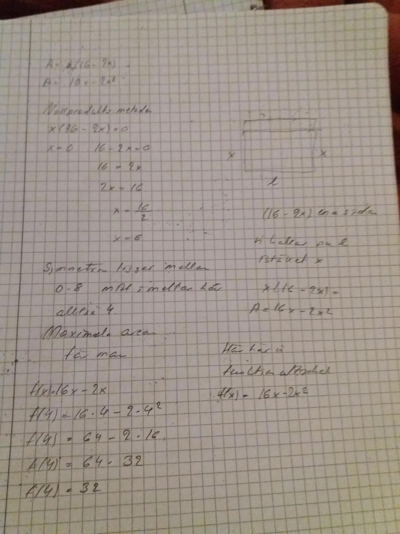Arean blir då A(4) = 4*(16 - 2*4) = 32.