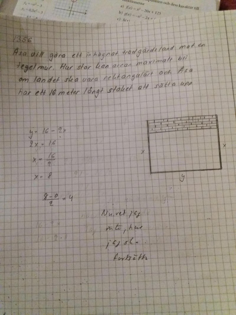 Vi har 16 meter staket och 2 styck bredd som vi kallar den för x. Stakets längd - 2 x som är y=16-x