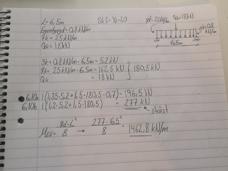 Jag ska dimensionerande balken i brottgränstillstånd alltså moment och tvärkraft. Men jag har fastnat på moment delen och kmr inte vidare.