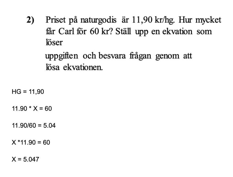 Sedan kan du sätta in 60kr som pris eftersom du vet att Carl har 60kr och undrar vilken vikt naturgodis han får för dessa. Då får vi din ekvation fast 60 på andra sidan likhetstecknet: