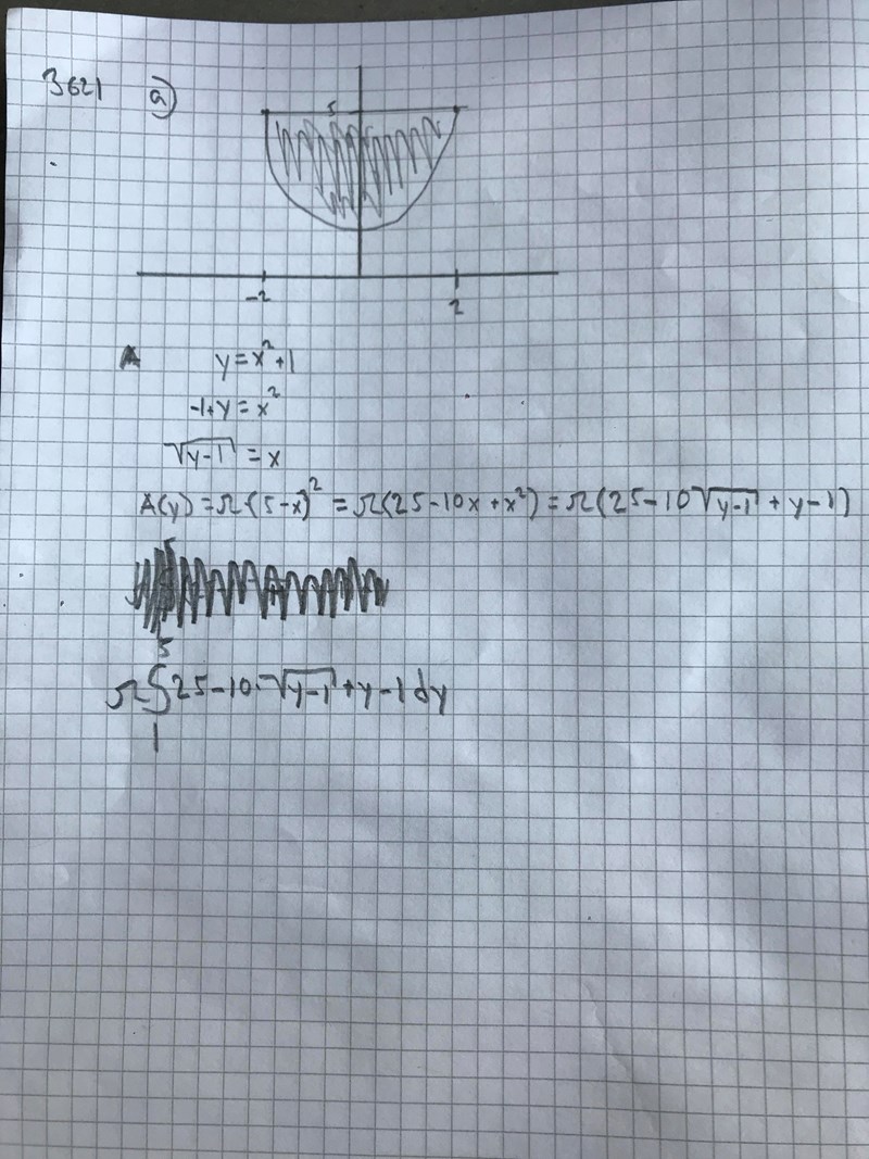Hondel skrev:Din bild visar endast området som ska roteras. När det sedan roteras runt y=5 kommer det även vara volym ovanför y=5. Därför blir dina gränser fel. Saknas det inte också en tvåa framför integralen?