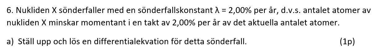 Det finns ett antal z atomer av nukliden X. Detta antal minskar med tiden. Minskningstakten är derivatan av z med avseende på tiden, dz/dt, med negativt tecken, definitionsmässigt. Minskningstakten är proportionell mot antalet atomer, enligt uppgiften, eller de försöker i alla fall säga det. Själv vet jag redan att det är så.