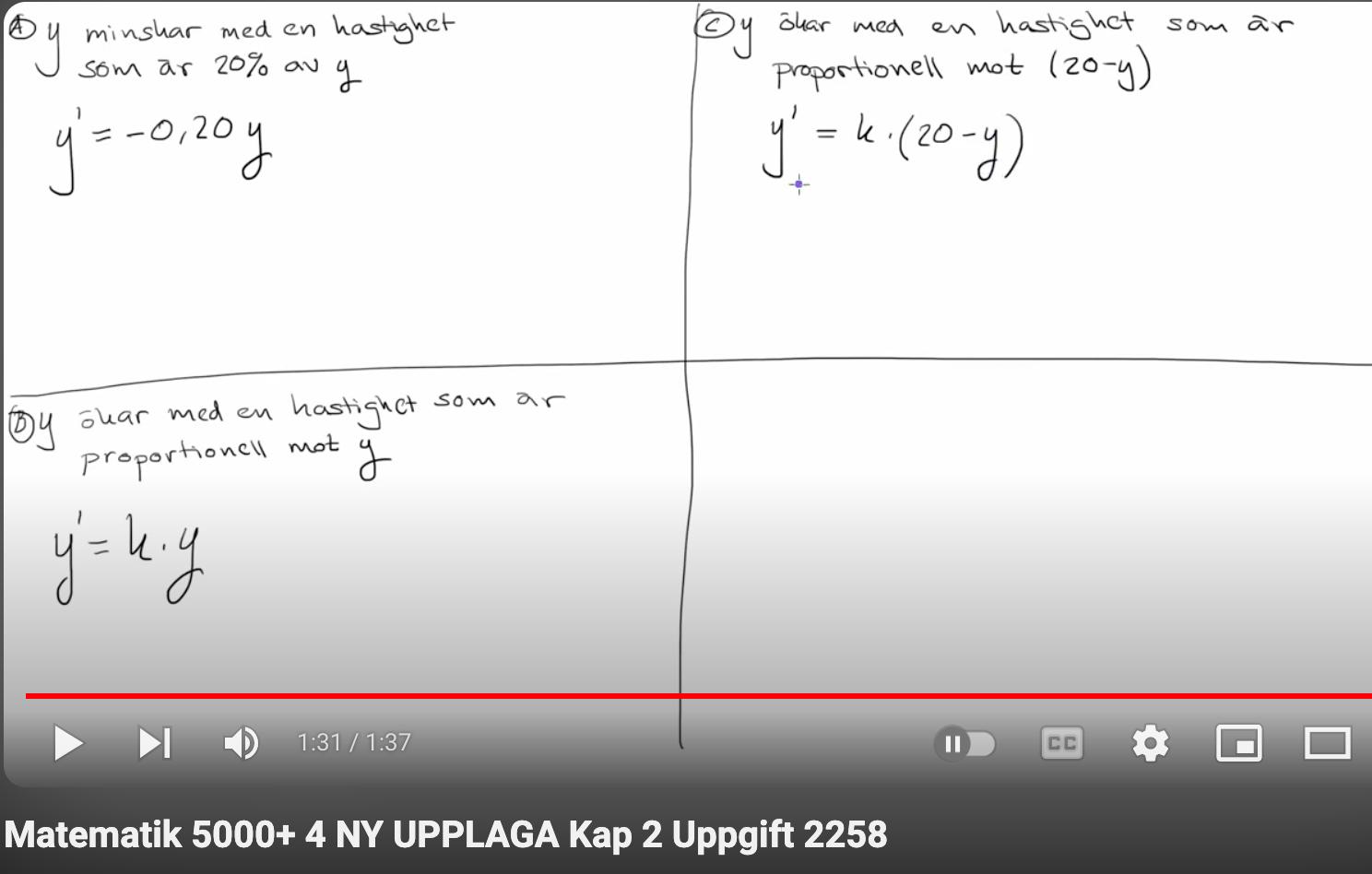 y prim är ju k. Dvs jag uppfattar det som att om något ökar "med en hastighet proportionell mot" så betyder det att k = det värdet. Att y' är ju k så varför skall man skriva in k i ekvationen?