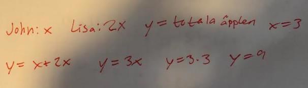 John har tre äpplen. Lisa har dubbelt så många. Hur många äpplen är det totalt? Ställ upp en ekvation.
