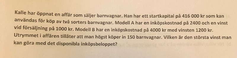 Jag förstår att jag på något vis måste ställa upp en varsin ekvation som beskriver vinsten om man bara köper barnvagnar av modell a respektive modell b. Men hur vet man om dessa ska vara andragradsekvationer eller följa räta linjens ekvation? Vet inte hur jag ska ta mig vidare med denna uppgift.
