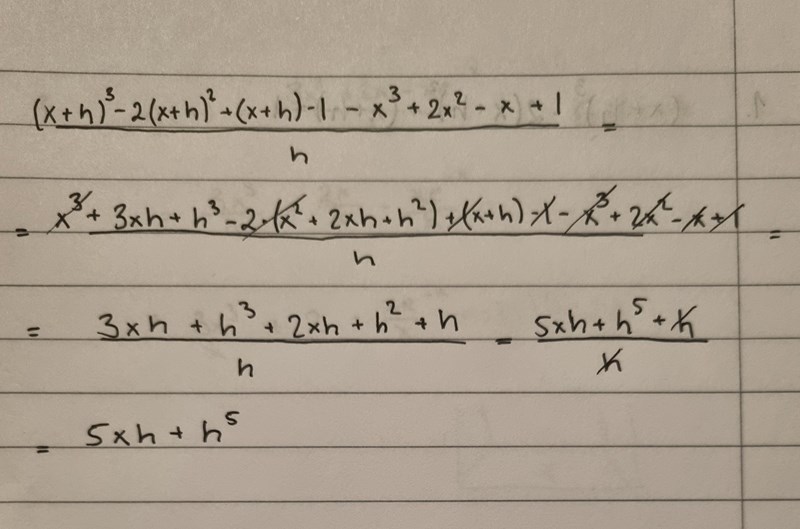 Först blir det (x+h)^3 - 2(x+h)^2 + (x+h)-1 och detta representerar då (f(x+h)). Sen måste jag också skriva -(f(x) och det är här jag blir lite förvirrad kring vad jag ska skriva.