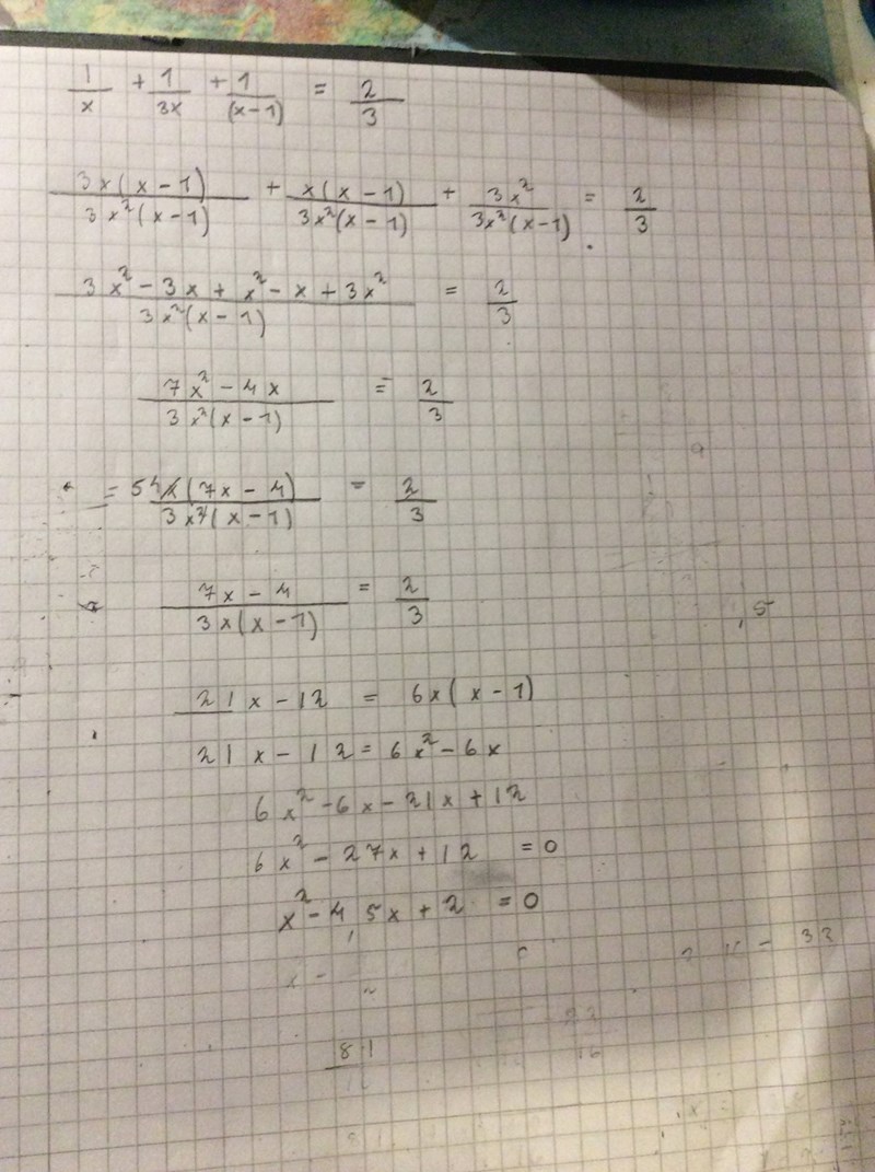 Tips: I stället för att göra liknämnigt i VL, räkna ihop täljarna och sedan multiplicera båda leden så att du får bort nämnarna, kan du börja med att multiplicera båda leden med mgn 3x(x-1). Du blir då genast av med alla nämnare och det blir mycket mindre att skriva.