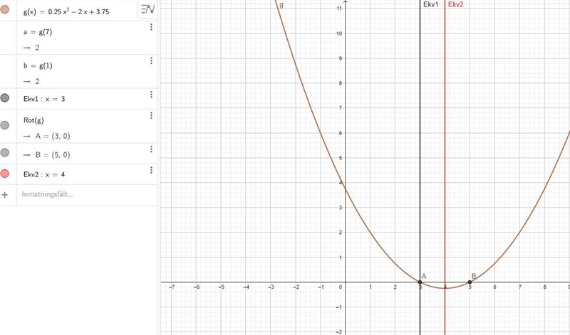 För att besvara frågan räcker det att känna till symmetrilinjen x=4 och att f(1) = 2. Vi behöver inte bestämma hela funktionen, och vi behöver inte veta något om nollställena. Eftersom det är en andragradsfunktion, så är den symmetrisk. x=7 ligger 3 steg höger om symmetrilinjen. Den når därför samma y som x=1, punkten tre steg *vänster* om symmetrilinjen. Och vi vet vad det y-värdet är.