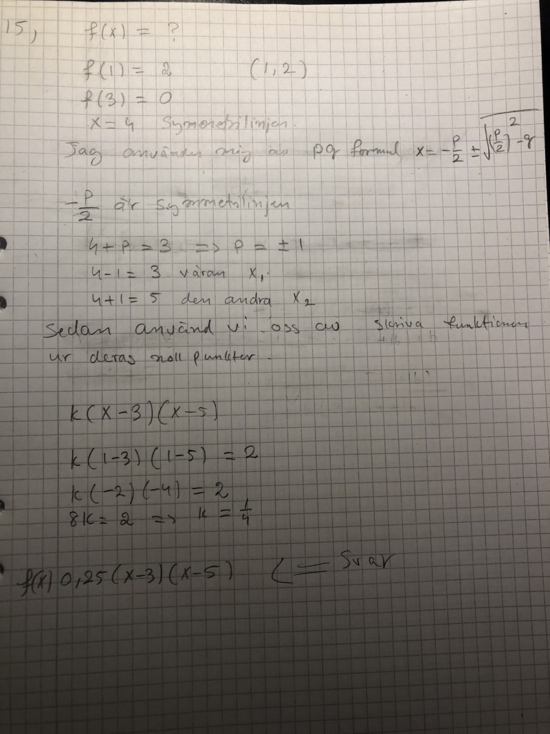 Till en andragradsfunktion f(x) vet man att f(1) = 2 och att ett nollställe är på x = 3 och symmetrilinjen på x = 4.