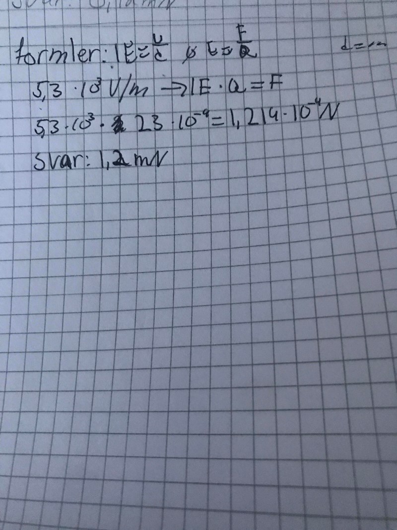 uppgiften: Ett homogent elektrisk fält har fältstyrkan 5,3 kV/m. En laddad blykula med laddningen med laddningen 23nc befinner sig inom det elektriska fältet. Hur stor elektrisk kraft verkar på kulan?