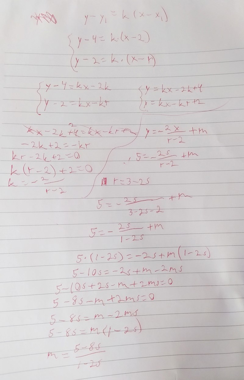 Jag tror att det du har gjort är att först ta reda på linjen genom (2,4) och (r,2) och sedan hitta m för den linje som har samma lutning och går genom (s,5), givet att r+2s = 3. Det finns inget som säger att det är samma linje som den första.