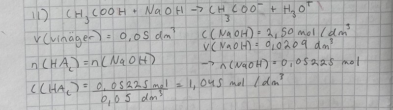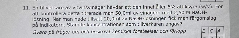 Sedan vet jag inte hur jag ska visa att vinägern innehåller/inte innehåller 6% ättiksyra. Jag har koncentrationen på syran men inte vinäger. Hur bör jag göra?