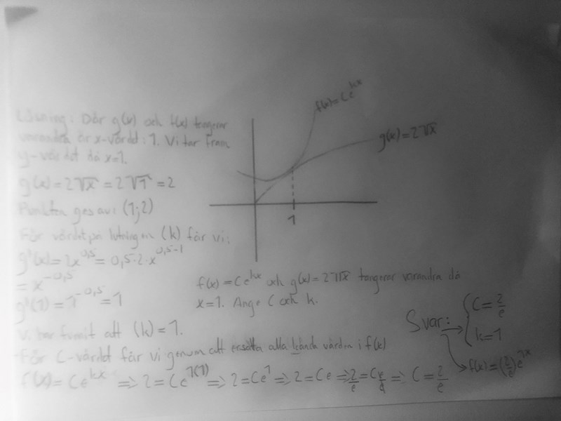 Dessa två grafer är skissade grafiskt och jag vill uppmärksamma om att bilden endast är ungefärlig... Det är ingen idé att helt luta sig tillbaka på bilden. Den finns för att visualisera problemet lite. Dessa två grafer tangerar varandra då x = 1 och jag ska med hjälp sv de två givna funktionerna och x - värdet ta fram värden på C respektive k. Jag har en klar lösning på problemet och jag vill veta ifall värdena för C och k är rätt då facit ej finns att tillgå.