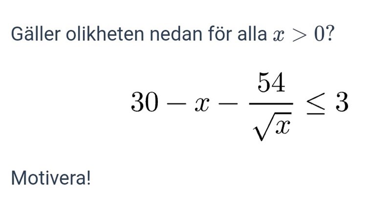 Om du sätter f(x)=x-54·x-0,5-27f(x)=x-54\cdot x^{-0,5}-27 så blir olikheten f(x)0f(x)\geq0