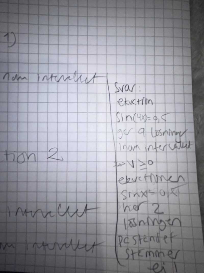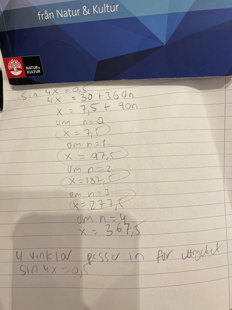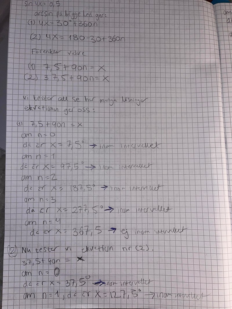 Ja det är alla lösningar i till ekvationen sin(4x)=0,5\sin(4x)=0,5 i det angivna intervallet.