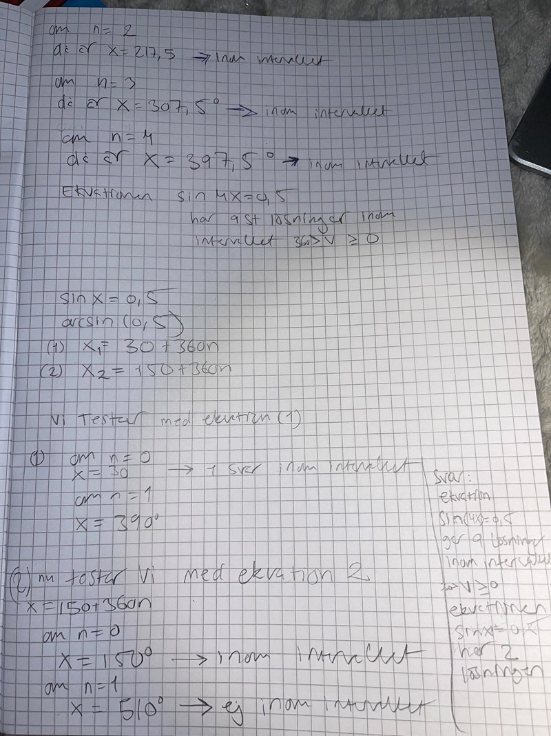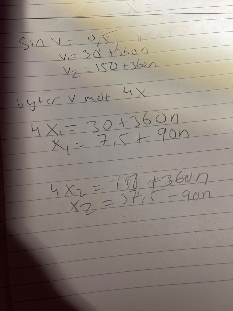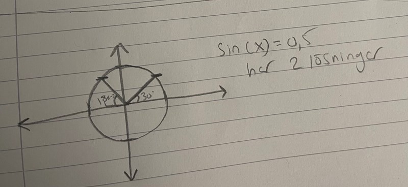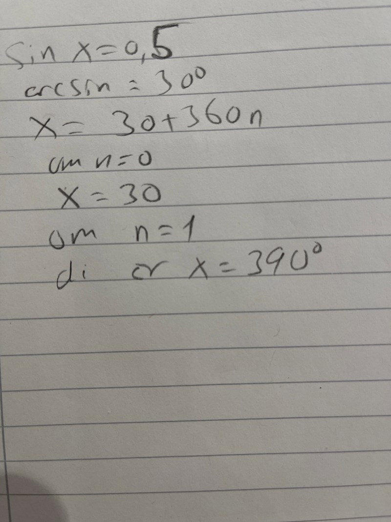 Kalla 4x för v.Lös ekvationen sin v = 0,5. Byt tillbaka.