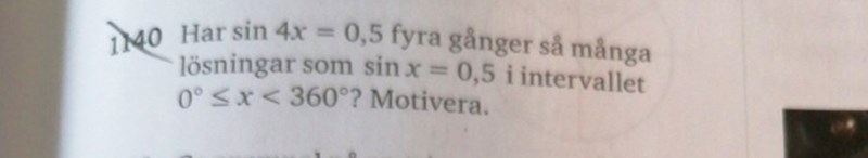 Hej. Enligt min uträkning nedan så stämmer påståendet. Sin4x=0.5 har 4 vinklar som passar in i intervallet som är given i frågan. Sin x har endast en vinkel som passar in i intervallet. Därav så stämmer påståendet ->