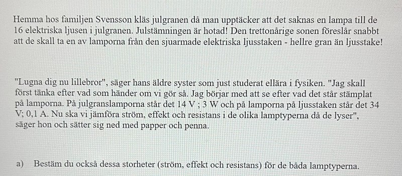 Det jag behöver hjälp med är uppgift b). Jag förstår inte riktigt hur jag med hjälp av beräkningar ska visa hur storasystern kan dra den slutsatsen eller visa att hon har fel. Det jag tänker direkt är att hon har rätt då julgranslamporna har en ström på 0,21 A medan ljusstakslamporna endast klarar av en ström på 0,1 A, så när hennes lillebror kopplar ljusstakslampan till julgranslampan så kommer strömmen vara för hög för ljusstakslampan och därför kommer glödtråden ”överhettas” och lampan släcks. Det är så här jag har resonerat men jag skulle lika gärna kunna vara ute och cykla nu. Som du ser så har jag bara resonerat med ord och vet inte riktigt hur jag ska visa detta med beräkningar. Jag uppskattar all hjälp!
