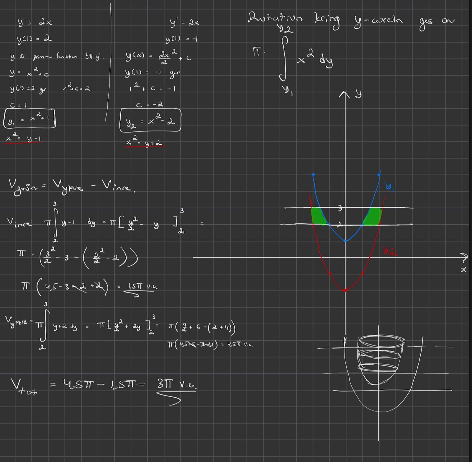 Hej, har hittat en uppgift på nätet som handlar om rotationsvolymer. Jag har inte tillgång till facit och undrar om någon skulle kunna bekräfta om jag har räknat rätt. Uppgiften: