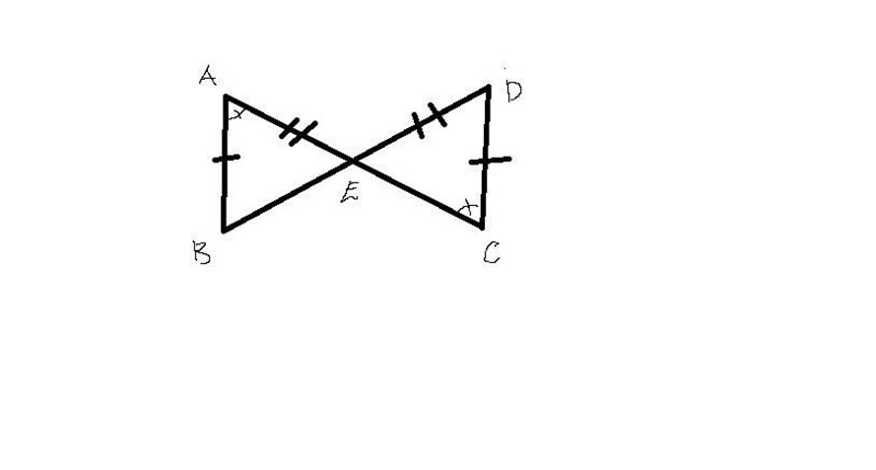 Efter att jag har besvarat de här med mig själv så känns det fortfarande konstigt, två vinklar på varje triangel är ju lika stora då vinkel E är vertikal vinklar, detta betyder ju att båda trianglar åtminstone är likformiga, sedan är två sidor också lika stora, intuitivt känns det som att båda trianglarna borde vara kongruenta men min bok säger annat.