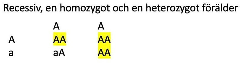 Platina skrev:Okej, jag tror att jag förstår bättre nu (jag gjorde några korsningsscheman). Enligt korsningsschemat (för recessivt) var risken 50 procent att barnen skulle drabbas av sjukdomen, men i två av fallen fick 100 procent av barnen sjukdomen.