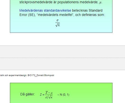 Skilj på en fördelning för en s.v. och en fördelning för ett medelvärde av en s.v. . De har två helt skilda fördelningar. Ett samplat medelvärde är väntevärdesriktigt och har alltså samma väntevärde som har (vilket är positivt, minst sagt...) dock kommer medelvärdet ha en annan standardavvikelse vilket framgår av de gröna rutorna ovan där, istället för , standardavvikelsen är där är "sample-storleken". Genom att normera med och blir fördelningen N(0,1). Detta gäller för alla fördelningar, enligt centrala gränsvärdessatsen, https://sv.wikipedia.org/wiki/Centrala_gr%C3%A4nsv%C3%A4rdessatsen. Ibland är halvkorrektion nödvändig, men det är överkurs.