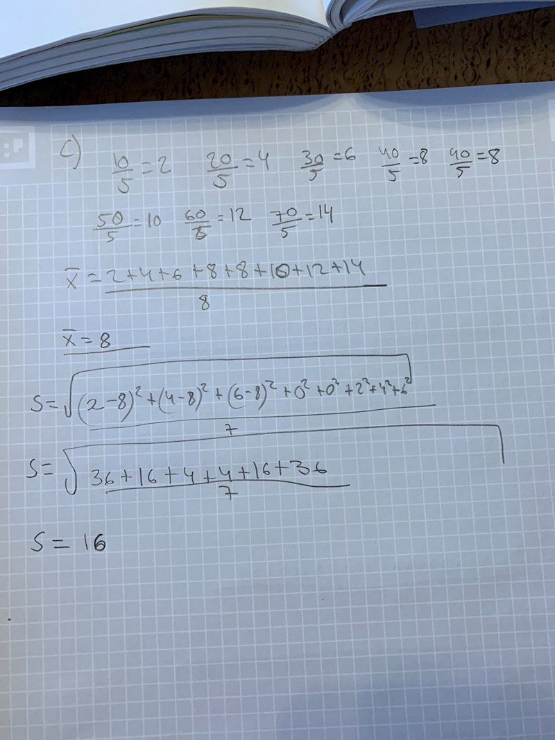 förstår ej denna fråga och hur standardavvikelsen blir 4. Jag får rätt på medelvärdet som är 8. Bifogar bild på mina uträkningar. Skulle uppskatta hjälp