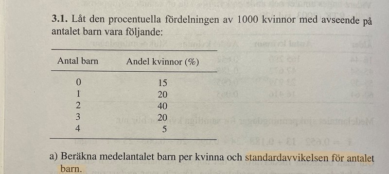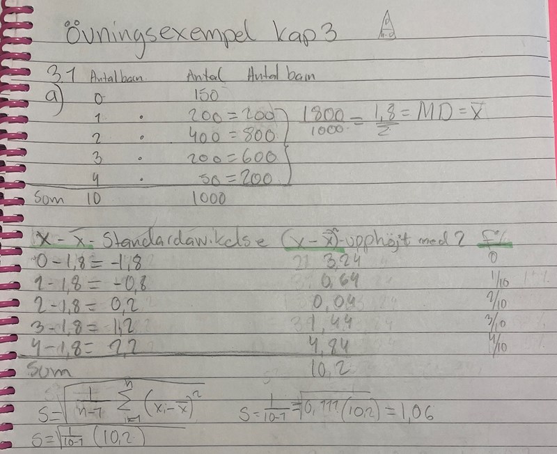 Fråga 3.1 a) jag har räknat ut medelvärdet men får inte ut rätt svar för standardavvikelsen vilket ska vara 1,08 barn. Jag måste kunna använda mig av formeln som är nedskriven på min uträkning som jag bifogar i kommentarerna.