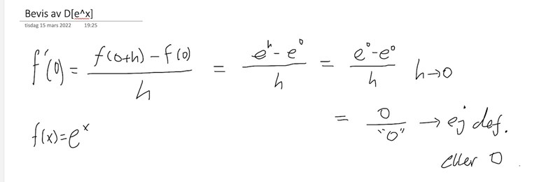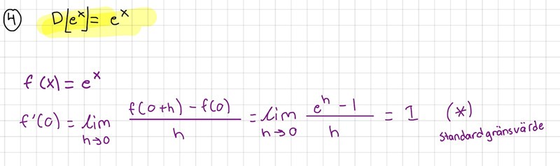 Om h går mot 0 har vi e=lim(1+h)1/h Därför kan det sökta gränsvärdet skrivas lim(((1+h)1/h )h -1)/h= =lim(1+h-1)/h=lim h/h=1
