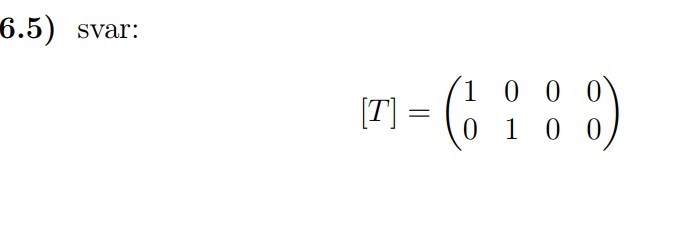 Sedan för att få reda på standardmatris så sätter man in enhetsvektorer för R4 e1=(1,0,0,0) e2=(0,1,0,0) o.s.v och ser vad funktionen spottar ut för varje värde och då får man: