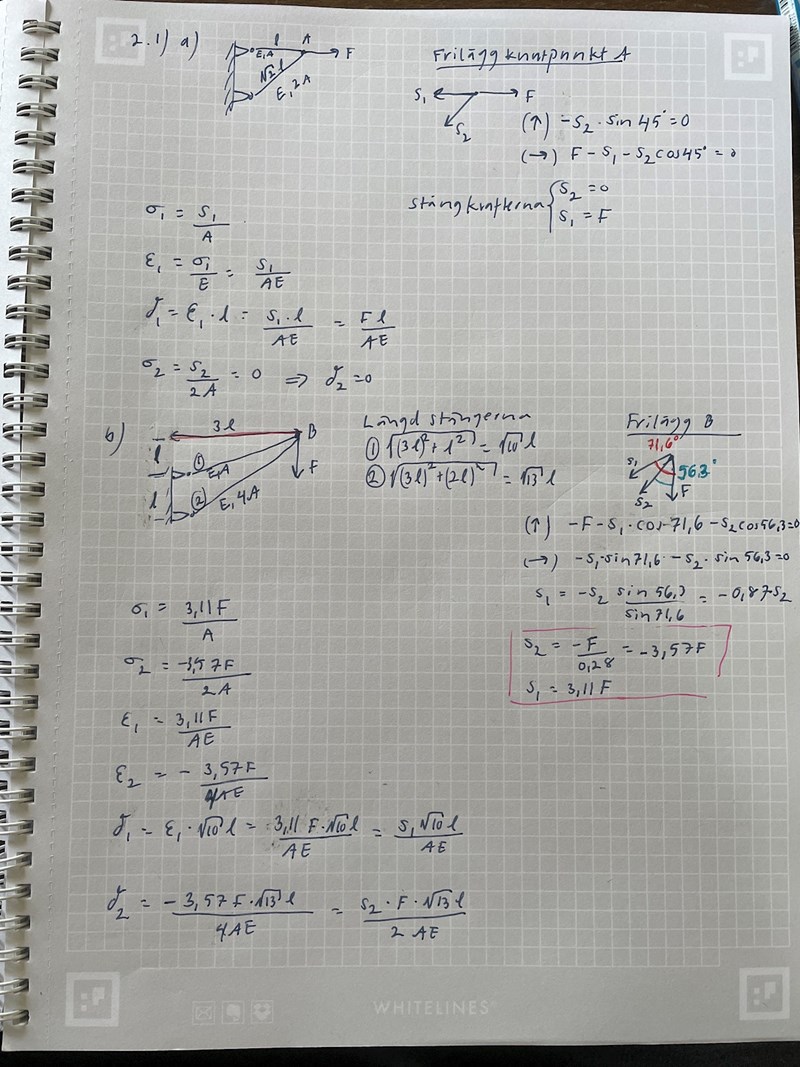 Hur jag har gått till väga är att jag har frilagt punkten och tagit fram stångkrafterna. Med dessa har jag kunnat få fram spänningarna, σ, samt töjningen, ε. Med töjningen har jag sen kunnat få fram själva förlängningen i stängerna.
