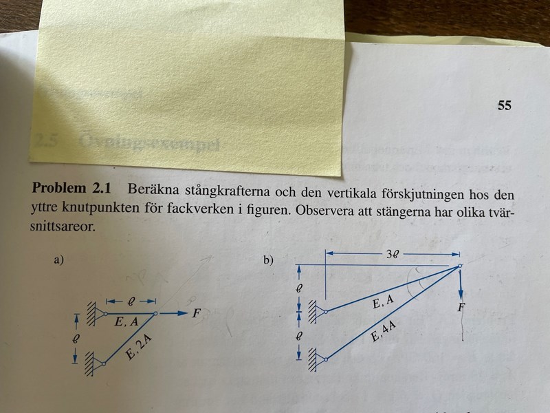Delta är förlängningen av varje stång. Jag har fått fram att förlängningen på stång 1 (i a-uppgiften) är Fl/AE, men att förlängningen i stång 2 är noll då kraften i stången är noll (S2=0).