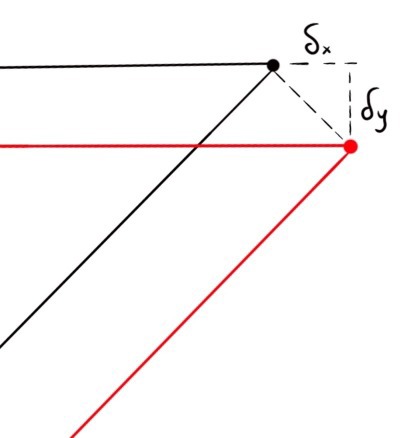 Sedan vet vi från geometrin som bibehålls pga små deformationer att δx=δy\delta_x=\delta_y.