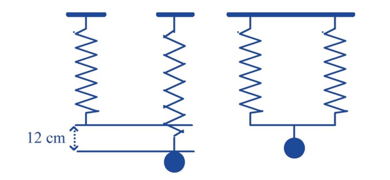 När fjädrarna parallellkopplas har varje fjäder en fjäderförlängning på 12 cm. Detta ger mig följande formel, med en dubbelt så lång fjäderförlängning.