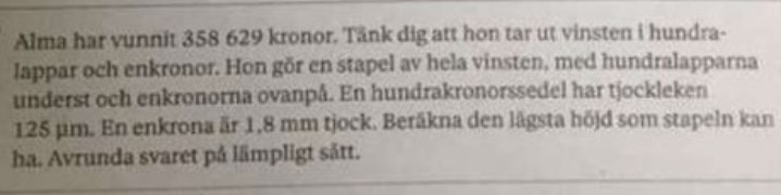 Alma har vunnit 358 629 kr. Tänk dig att hon tar ut vinsten i hundralappar och enkronor. Hon gör en stapel av hela vinsten, med hundralapparna underst och enkronorna ovanpå. En hundrakronorssedel har tjockleken 125 pm. En enkrona är 1,8 Mm tjock. Beräkna den lägsta höjd som stapeln kan ha. Avrunda svaret på lämpligt sätt.