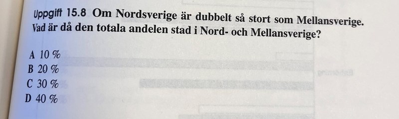 Om 5 % av 2x och 20 % av x är stad, hur stor andel av 2x+x är då stad?
