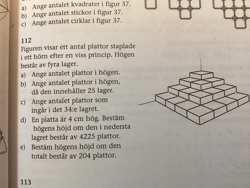 Hej, fråga 112) del d har jagt försökt lösa men kommer ingen vart. Från tidigare använde jag mönstret n upphöjt till 2 men just i den frågan verkar det inte fungera att använda? Skulle uppskatta all hjälp jag kan få!