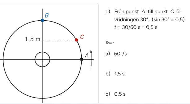 Om radien är 3 så ska man nog tolka 1,5 som halvvägs mellan origo och punkten B. (Först tänkte jag att det var den streckade linjens längd.) Eftersom sinus för 30° är 1/2 och 1,5 är hälften av 3 så har hjulet roterat ett tolftedels varv. På 60 sekunder roterar hjulet tio varv, så det tar en etthundratjugondels minut. Mitt svar är 0,5 sekunder.