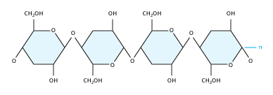 - Cellulosa- Uppbyggd av beta-glukos och bildar långa raka kedjor. Strukturformeln är (C6H10O5)n