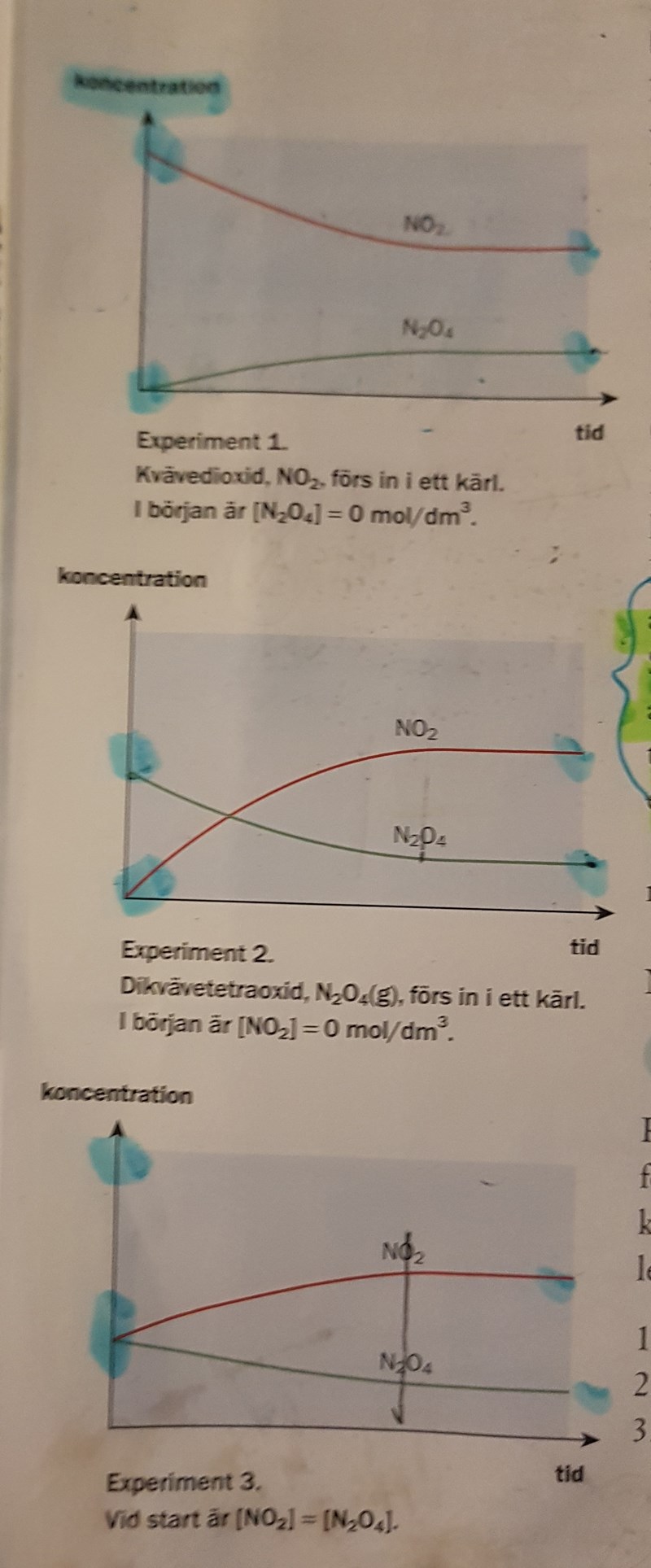 1“Sammansättningen av en behållares innehåll vid jämvikt bestäms av flera faktorer. Sammansättningen vid jämvikt beror på startkoncentrationerna av de ämnen som ingår i blandningen. Det beror dessutom på temperaturen och på utgångsämnenas och produkternas kemiska egenskaper” ⚫Det verkar som att man börjar med olika startkoncentrationer i diagrammen men man får ändå samma sammansättning vid jämvikt? Sammansättningen borde bli annorlunda enligt första infon i fetstil? (men i diagrammen når No2 och N2o4 exakt samma koncentration vid jämvikt i alla tre exempel)